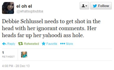 **** UPDATE, 12/31/13: Thanks to everyone who reported the hate tweet to Twitter. But it is unfortunately still up. This cowardly Muslima bigot couldn’t take the heat, so she changed her Twitter name again to avoid her tweet being reported. But I’ve updated the information, so if you could not report the tweet before (due to her name change), you can report it now. Here’s how:
