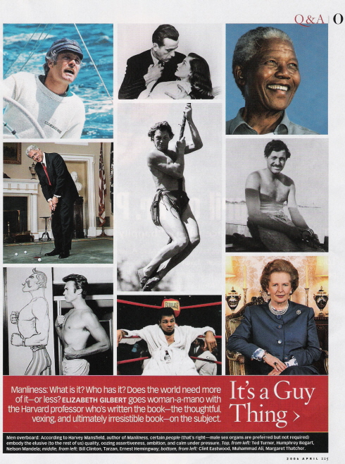 The April issue of her magazine, “O”, of which Oprah is “Editorial Director,” asks about “Manliness: What is it? Who Has it?” The opening page of the article, “It’s a Guy Thing,” features a pictorial of all men (Mohammed Ali in the ring, Clint Eastwood in his younger days sticking his shirtless chest out,” Tarzan, etc.) . . . and Margaret Thatcher. The pictorial, captioned “Men overboard,” has Thatcher right over the “It’s a Guy Thing” title of the article.
