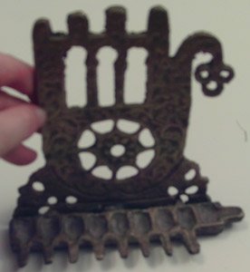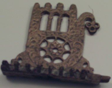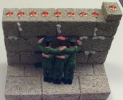 ,” and shows Israeli soldiers praying at the Western Wall, the holiest site in Judaism. It’s designed by Uri Kaufman. The third is an old Kurdish menorah I bought from a Kurdish Jew in the Machaneh Yehudah Market of Jerusalem. The “Hamzah” [“Five”] hand symbol is a good luck symbol in Judaism (and to Muslim Arabsl). It’s not a kosher menorah because the ninth prong, the “shamash,” isn’t higher than the others (more on that below). But I like it, anyway, and don’t use it for the lighting ceremony.
