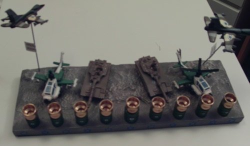 The first is a cool menorah with Israeli Defense Forces F-16s (or is it F-15s? not sure), tanks, and helicopters. The planes, on metal rods, rotate around. It’s called the “Israeli Army Menorah ELARMY Menorah” and is designed by artist Reuven Masel. The second one is my favorite and is called “IDF Chaverim [Hebrew for “Friends”]