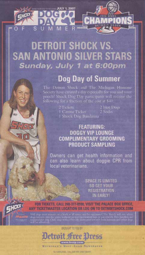 And since it would be mean for me to comment on the unlimited amount of female dog and bitch jokes and double entendres, I won’t do that. Instead, I’ve posted, above, the ad that WNBA teams ran Sunday around the country, inviting dogs to attend the games as VIPs (PETA will be proud). I’ll let you think up and insert your own lines. . . .