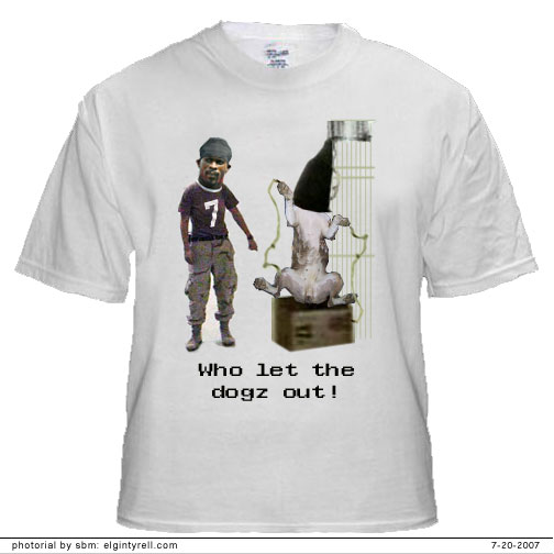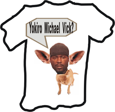 And here are two other Michael Vick Ts, one by Elgin Tyrell (we , Friday), the other by Fred Taub of Boycott Watch. Fred spells the Spanish part wrong on purpose, since we doubt Michael Vick, er . . . OOKIE, can spell it properly (and probably thinks it’s Japanese, being the Ron Mexico that he is):