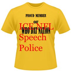 The NFL recently obtained an order through the Florida Department of State for the rights to “Who Dat?” a slang term you can hear in virtually every Blaxploitation film, BET program, stupid Tyler Perry flick (redundant phrase), or Al Sharpton-Sean Vannity love fest.  It means, “Who’s that?”  And you can also hear it on the Cajun streets of New Orleans, where fans–both Black and White–of the New Orleans Saints, projected onto their beloved, forever-losing team  . . . a team which is now miraculously in this weekend’s Super Bowl. So, in addition, to unconstitutionally restricting the free speech and commercial rights of vendors of t-shirts that say “New Orleans Football,” this week, ICE agents in Miami will be seizing “Who Dat” t-shirts.  It’s funny how the mostly White guys atop the NFL now own the rights to a stupid slang saying for the ebonics crowd who can’t–and refuse–to speak English.  And it’s really something that would never pass muster before the Supreme Court.