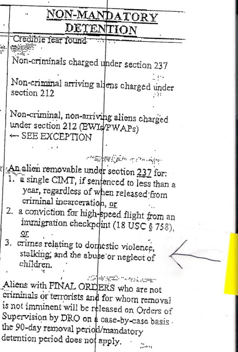 If this were not bad enough, below are the instructions Julie Myers gave her Detention & Removal Operations agents regarding which aliens can be released (“NON-MANDATORY DETENTION”): those convicted of “crimes relating to domestic violence, stalking, and the abuse or neglect of children,” among others. As the agent who sent us this wrote, “Kick ’em back on the street [candidates] include child abusers!”