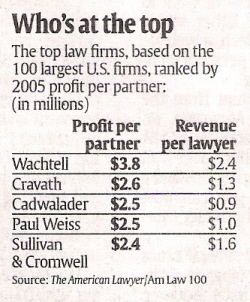 USA Today reports that the average profit per partner at one of America’s Big 100 law firms is over $1 million. The top 10 firms all topped $2 million per firm, with one, Wachtell, garnering $3.8 million per partner. All of the top firms made at least close to a million, if not much more, in firm revenue per attorney.