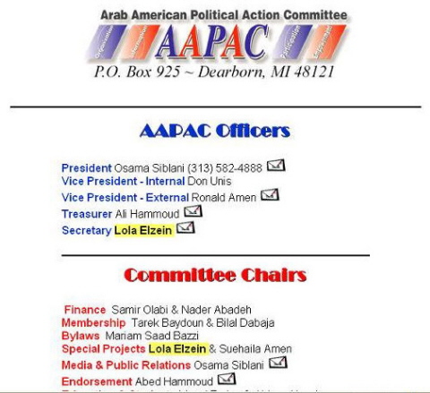 Take the case of Lola Elzein a/k/a Lola Ali Elzein, who has cyber-stalked me and threatened my life and the lives of my family members. She is Secretary of the Arab American Political Action Committee–the Muslim group whose endorsement President Bush vehemently sought in 2000 and 2004 (and got in 2000). (She’s also “Special Projects” Committee Chair for AAPAC–perhaps threatening me is a “Special Project.”) She’s also an activist in “former” terrorist ADC (American Arab Anti-Discrimination Committee). Ms. Elzein, a Dearborn Heights, Michigan resident, is a Muslim Lebanese student at the University of Michigan-Dearborn, where she headed the Arab Students Union.