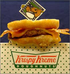 * Cheeseburger doughnuts. The Gateway Grizzlies, an independent baseball league team in Sauget, Ill., started selling “Baseball’s Best Burger” this month: a $4.50 cheeseburger with two strips of bacon grilled between a sliced Krispy Kreme doughnut. (The glazed sides are flipped to the inside for less mess.)