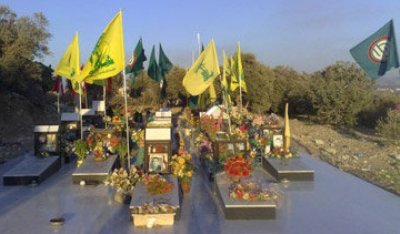 Hezbollah & Harakat Amal Terrorist Flags Adorn Martyrs Coffins Monument #2 in Rima Fakih’s Srifa, Lebanon