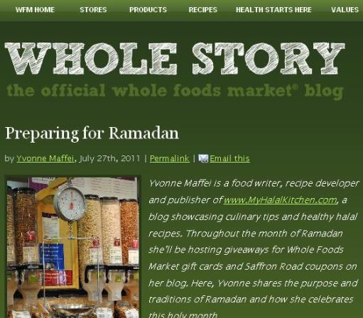 Whole Foods is teaming up with Halal frozen entree brand Saffron Road (who sell a variety of Indian-, Thai-, and Moroccan-flavored dinners) to host several promoted blog items on Whole Foods’ website along with sponsored giveaways of Saffron Road food and supermarket gift certificates. Additional content for the campaign is being added by Yvonne Maffei of the My Halal Kitchen blog. While it is a relatively small promotion, it also marks a new benchmark for the Muslim-American community: the first coordinated Ramadan promotion by a national supermarket chain. . . .