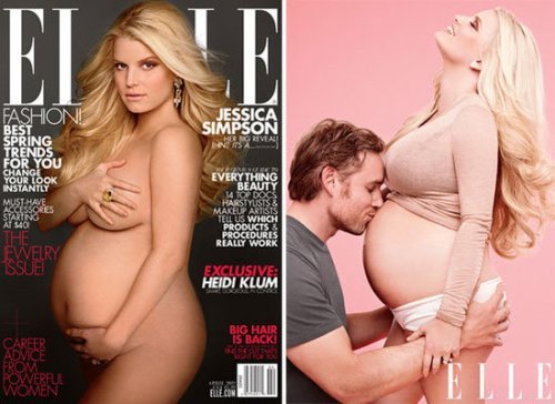 If you’re one of those weird sickos who has a strange fetish for naked pregnant women, this post isn’t for you. Report to your nearest loony bin. But for everybody else, I hope you agree with me that this “look at me naked and pregnant” craze must go. First, it was Demi Moore years ago, when she hadn’t yet moved on to marrying her son. Then, it was fellow skanks Britney Spears and Christina Aguilera. Then, it was Mariah Carey and Nia Long, ‘cuz you know that in the age of civil rights and equality the Black chicks gotta get in on the stupidity. And now it’s Jessica Simpson. And she’s not just posing pregnant and nude on the cover of the latest issue of Elle magazine. She’s also shown again in underpants with her babydaddy kissing her stomach. Uggh. Yet another thing to file under the TMI category. Too. Much. Information.