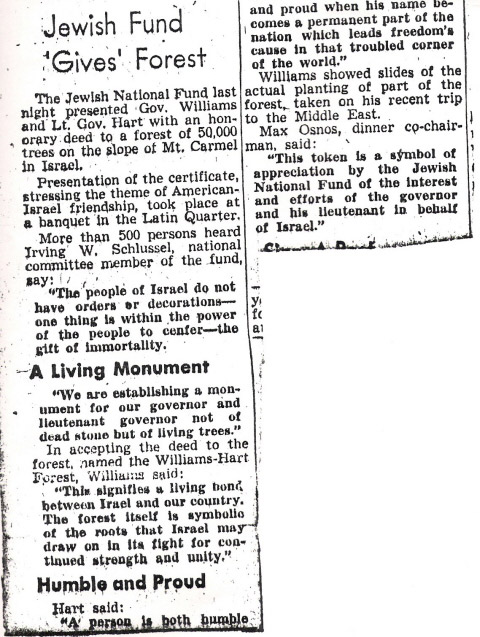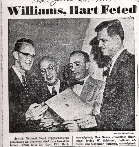 Also, below, is another article from The Detroit Times from 1951. It is about a dinner, also hosted by my grandfather, Irving Schlussel.The dinner was in honor of then-Michigan Governor G. Mennen “Soapy” Williams and Lt. Governor (later U.S. Senator) Phil Hart. Although he is not mentioned in the article or pictured in the photo, John Dingell Sr. was in attendance, because, again, he was a strong supporter of Israel, unlike his terror-apologist son, who has been in office 50-years too long. At this dinner, the Williams-Hart Forest in Israel was established.