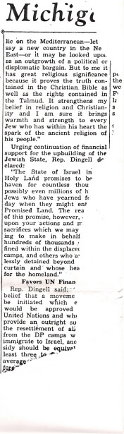 Below is an article from The Detroit Times, from November or December of 1948, not long after Israel became a State. It is about a pro-Israel dinner hosted by my late grandfather, Irving W. Schlussel, a lawyer, Detroit Jewish Community Council President, and President of the Jewish National Fund (which reclaims swamp and rocky land in Israel and plants trees on it). John Dingell, Sr. is one of the honorees, and he is pictured in the photo with my grandfather. Dingell, Sr. was inscribed in the JNF’s “Golden Book” for his support for Israel. His statement (some of which is unfortunately cut off in the only copy in my possession) is very pro-Israel. Today, he is probably turning over in his grave, at the disgusting actions and statements of his terror-apologist son.