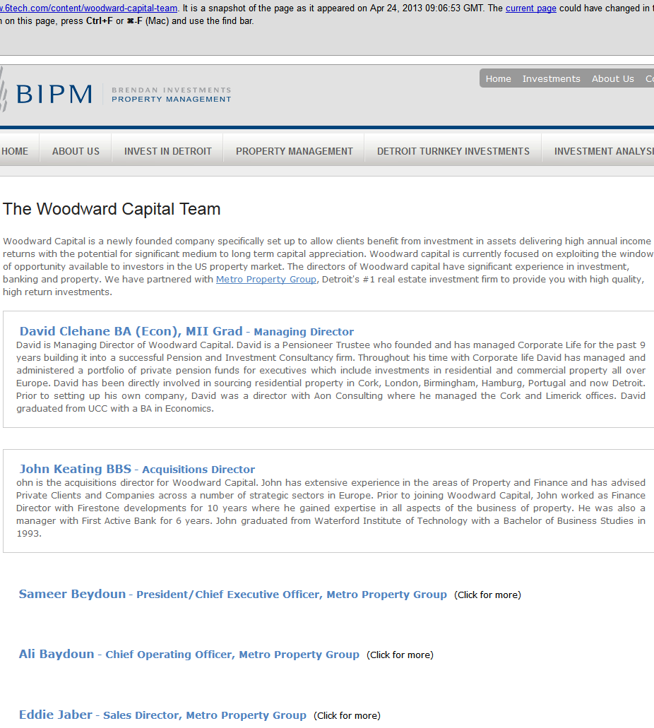 The perpetrators of the Ponzi scheme, Metro Property Group and its principal shareholders and officers, Sameer Beydoun, and Ali Beydoun, have formed a partnership with Irish investment company, Brendan Investments, which has reportedly paid the Ponzi schemers 15 million Euros for a joint venture, Woodward Capital, involving the shabby Detroit homes (and enabling the Defendants to purchase the homes). The non-executive Director of Brendan Investments is the well known Irish celebrity financial adviser, Eddie Hobbs. Since the recent filing of this lawsuit, Hobbs and his Brendan Investments first claimed they never had any partnership and scrubbed a website detailing their very extensive partnership (the website contents, through the “magic” of Google’s cached links, can be viewed here). And a screen capture of the page is viewable below. Later, Hobbs and Brendan Investments changed their story and admitted a partnership with the Defendants for the last 18 months, endorsing the company and Defendants alleged to have engaged in a giant Ponzi scheme, apparently enabled with Brendan Investment funds whether wittingly or unwittingly.