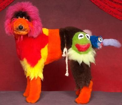 I’m not supporter of PETA–or as we call it on this site, “PUTAh–People for the Unethical Treatment of Animals and humans”–but if there was ever a time to ask, “Where’s PETA when you need ’em?” this is it! Check out what some woman did to her dog to win a competition. And other dog owners have done the same ludicrous thing. Um, G-d created a dog to look like a dog, not a bad hooked rug design from your great-aunt in 1973. Your dog is not supposed to look like the Muppets or a giraffe or the band KISS. It’s especially NOT supposed to look like a raccoon is permanently having sex with it. (Photos of all of that, below.) Sorry. It’s just wrong. And you probably have Waaaay. Tooooo. Muuuuch. Time on your hands.