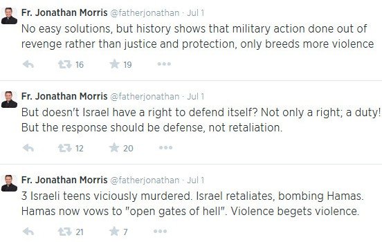 While Morris barely let out a peep on the Palestinian Muslim murder of three Israeli Jewish teens, the prominent Catholic priest–brought to stardom by FOX News where he has been reportedly paid well over a hundred thousand dollars to appear since 2005–is attacking Israel for responding (and yet there hasn’t even been much of an Israeli response). This schmuck thinks Israel should just sit there and take more killings because “violence begets violence.” Yaaawn. This guy has watched the moral equivalency movie “Munich” by Abu Spielberg (read my review) too many times. Oh, and this FOX News putz also enjoys retweeting with approval the anti-Israel tweets of CNN’s Syrian anti-Israel anchor Hala Gorani. Here are some of his tweets on Twitter (follow me on Twitter):