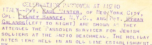 Pvt. Paul Winter, Cpl. Sidney Banney, and Pvt. Hyman Galanos Pray @ Passover Services, April 1944 @ Anzio Beachhead, World War II, During the Battle at Anzio – More Details Here . . .