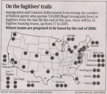 Still, is it really necessary to give out details about how many new fugitive round-up teams there will be, where they will be concentrated (as provided in today’s USA Today), or even that this is happening at all? We don’t think so. In fact, we’d be happier if we got the news after the fact–like an announcement of all the fugitives newly rounded-up and deported.