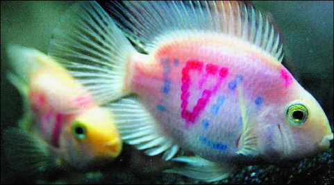 The fish are imported from China and injected with a dye or burned with a laser with messages like “I (heart) you.” They cost $39-$50 a pop.