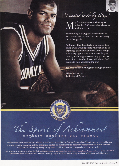 And that’s why I was amused by its racist marketing campaign, which I happened upon. Since I live in a black neighborhood, businesses near my home feature a lot of Black magazines and other cultural phenoma. At one business, I picked up a copy of the January issue of African American Family magazine. Below is the full-page ad Country Day uses to recruit Black students. It features NBA star and Country Day alum Shane Battier and screams: “Hey Homies, come play basketball wit’ us and reach the NBA. Hoop Dreams, Baby.”