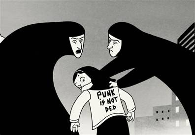 The movie is autobiographical, as we watch Marji (the young Marjane Satrapi) grow up in the stiltifying aftermath of the Islamic revolution in Iran. Though Islam is never mentioned by name, it’s quite clear who is the cause of this extremism. Women in hijabs and religious police take over every institution and school. Marji is almost beaten for wearing “radical” Chuck Taylor basketball shoes and a “Punk is Not Ded [sic]” T-shirt, along with her Muslim headcovering. The headcovering is the symbol of the oppression that has set in, the rights that have been taken away, the persecution that becomes a way of life.