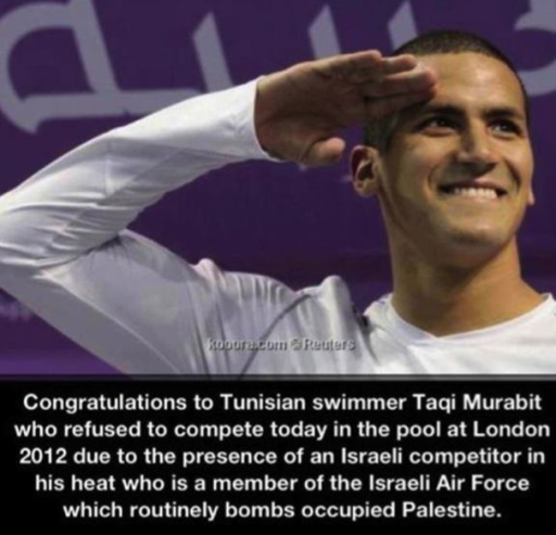 Tags: Anti-Israel, Australians for Palestine, Gal Nevo, IDF, Israel, London Olympic Games, London Olympics, Olympic swimming, Olympics, Oussama Mellouli, Sgt. Gal Nevo, swimmers, swimming, Taki Mrabet, Taqi Murabit, Tunisia