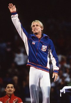 U.S. Olympic Gold Medalist Swimmers Michael Phelps (2008), Mark Spitz (1972) on the Medal Stand