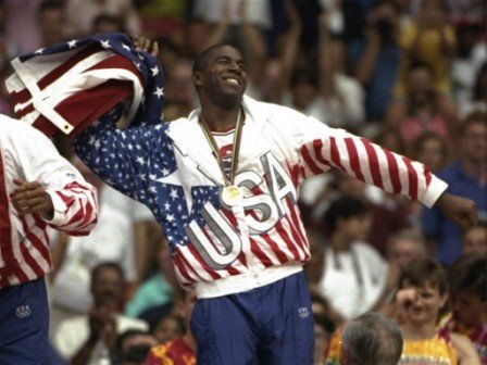Scottie Pippen, Magic Johnson & Other U.S. Olympic Basketball Dream Team Olympic Gold Medalists on Medal Stand (1992)