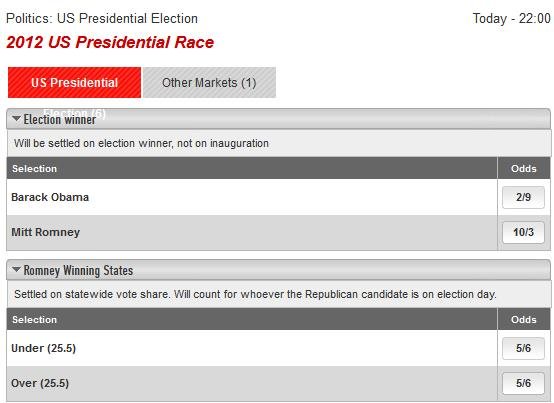 First, let’s look at the odds from a practical standpoint. As I understand how these odds work, with Obama posted at 2/9 and Romney posted at 10/3, to interpret these odds, we first convert those fractions into cardinal numbers; hence Obama at 2/9 is really 0.222 and Romney at 10/3 is really 3.333. So, this should mean that for every $1 risked on Obama, if Obama wins, the bookmaker will pay the bettor $0.222 plus the original $1 bet. Conversely, for every $1 risked on Romney, if Romney wins, the bookmaker will pay the bettor $3.333 plus the original $1 bet.
