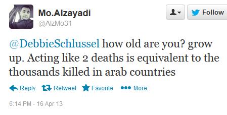 Above is one of the latest tweets I received from Mohammed “Mo” Alzayadi. He erased the tweet, but not before I copied it. You see, he thinks that American lives aren’t worth much . . . kinda like the vast majority of his fellow Muslims think. And, so, to him the three murders and well over a hundred Americans seriously maimed and missing vital limbs and body parts, is no big deal and not important to him. He doesn’t think like an American, even though he was raised here and had every American opportunity. To him, as he notes in his tweet, Arab lives in other countries are more important than American lives. And that’s because Al-Zayadi, just like his fellow Muslims throughout Dearbornistan and the rest of this country, don’t think of themselves as Americans. They think of themselves as Muslims first. “Arabs” first.
