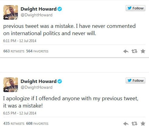 Houston Rockets player Dwight Howard waded into political hot water Saturday after he took to Twitter to comment on the Israeli-Palestinian conflict. The tweet, which read” #FreePalestine,” was posted late Saturday afternoon and was deleted 15 minutes later. Howard then tweeted that the message was a mistake and apologized for offending anyone.