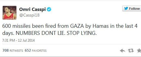 NBA Houston Rockets player, Dwight Howard, who allegedly graduated from a Christian high school in the South, tweeted #FreePalestine on his Twitter account, but then quickly deleted it and apologized (clearly because someone told him to, not because he doesn’t support the HAMAS movement and the Palestinian rocket-shelling side of things). He’d be best advised to learn a little something from his Jewish Israeli teammate, Omri Casspi, who gets it.
