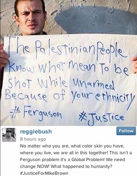 Bush also included a caption — “No matter who you are, what color skin you have, where you live, we are all in this together! This isn’t a Ferguson problem it’s a Global Problem! We need change NOW! What happened to humanity? #JusticeForMikeBrown.”
