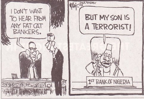 Tags: Abdulmutallab, Alhaji Umaru Mutallab, bankers, Barack Obama, cartoon, cartoon of the week, Flight 253, Flt. 253, Northwest Airlines, NWA, political cartoon, Umar Farouk Abdulmutallab