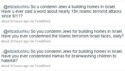 Our friend, the JIDF (Jewish Internet Defense Force) responded to her far better than I could, so below are JIDF’s retweets.  Follow JIDF on Twitter.  And don’t forget to follow me on Twitter, too.  Since Eliza Dushku believes that Jews shouldn’t be allowed to live where they want to, I believe that Jews shouldn’t be allowed to see or patronize any of her movies or TV shows.