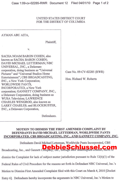 Tags: Al Aqsa Martyrs, Al Aqsa Martyrs Brigade, Al Aqsa Martyrs Brigades, Ayman Abu Aita, Bruno, David Letterman, David Michael Letterman, Federal court, Islam, Islamic Terrorism, Islamic terrorist, Israel, lawsuit, lawyers, Muslim, NBC, NBC Universal, No Palestine, not a country, Palestine, Palestinian, Sacha Baron Cohen, Sacha Noam Baron Cohen, terrorist, There is no Palestine