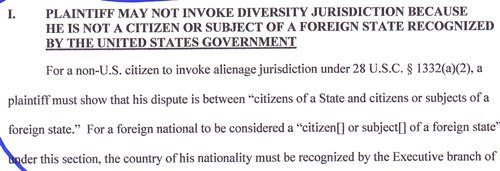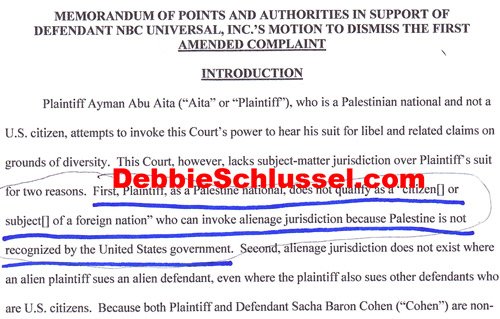 Aita claims he’s a citizen of the West Bank, Palestine. But there’s no such recognized country, and unless he files as an alien citizen of a recognized nation–like, say, ISRAEL (which he won’t do because he refuses to recognize it)–he has no standing to file the case under the laws he’s invoking in federal court, and the court doesn’t have jurisdiction to hear the suit. That’s the argument that Letterman and NBC are making, and it’s a valid one, which has been upheld in virtually every federal court, whether at the trial level or on appeal.