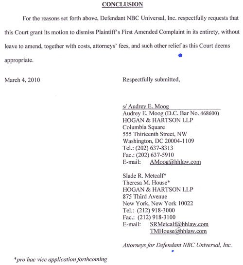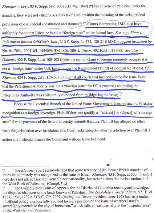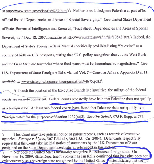 Here are the key portions of NBC Universal”s Brief in Support of its Motion (yes, the NBC lawyers got right what Letterman’s didn’t). Unfortunately, NBC is wrong about U.S. government documents not recognizing this fictional country of “Palestine,” as I’ve noted how the State of Illinois has done this with certain legal documents, unfortunately, and–as NBC’s lawyers point out–in violation of U.S. law, and I’ve also noted how the U.S. government has been revoking birth and death certificates with “Jerusalem, Israel” marked as place of birth or death, changing it to “Jerusalem” without a country. That, too, is, frankly, in violation of U.S. law. And NBC gets this right. (Please excuse my blue magic marker.)