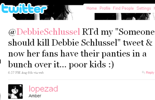 Tags: Amber, Amber Lopez, death threats, DebbieSchlussel, murder, someone should kill @debbieschlussel, Twitter