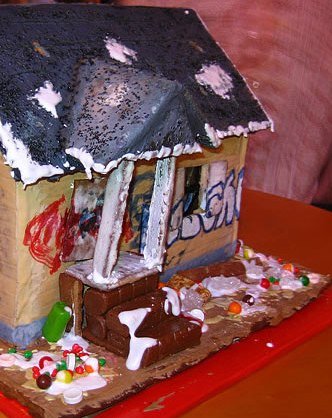 Reader and friend Mary sends this link to the world’s wackiest gingerbread houses. The only one I really like–because it reminds me of a ton of houses I see driving through Detroit–is this one, below. I can’t post the whole picture because of some of the graffiti, but you can go to the link and see the whole thing.