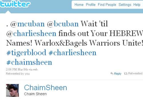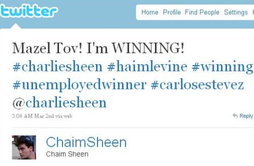 And then there’s Chaim Sheen, the personality I created for Twitter. I thought it would be fun, but like everybody else, I got sick of even making fun of this jerk after a couple of days. Plus, it didn’t catch on. I asked our friend David Lunde of Lundesigns to take the pic of Charlie Sheen from the police station scene in “Ferris Bueller’s Day Off” and put a Jewish star yarmulke on him. But, once I learned he was bragging about being Jewish to counter charges that he was anti-Semitic, I was thinking, OY! Do we really gotta claim him? Can’t we put him in the list of Jews we don’t wanna claim, like Roseanne, Ron Jeremy, and Brian Moskowitz? I decided my Chaim Sheen tweets about Warlox&Bagels Warriors were as stale as a Pastrami and Tiger Blood on Rye sandwich from Two And a Half Delis. Anyway, above are some of my Chaim Sheen tweets.
