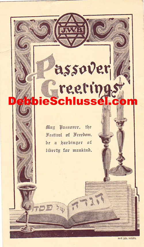 Also, below are two Passover postcards that Jewish-American soldiers sent home, while serving in World War I and World War II. The first one is from a member of the AEF in France during World War I. It’s from a soldier to his sister in Stockton, California. You’ll note it has a censor stamp on it. It is postmarked April 25, 1919. The postcard was printed by the Jewish Welfare Board. The date of printing is April 15, 1919.