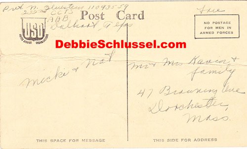 The second post card is from World War II. It is from Private N. Bluestein. It is also a Jewish Welfare Board postcard. Check out the second postcard . . .