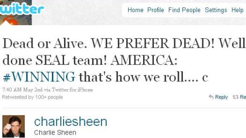 **** UPDATE: Facebook Friend Carlos Ortiz (join me on Facebook) reminds me that Charlie Sheen is a 9/11 Truther. So, um, why is he celebrating Bin Laden death, if he doesn’t think Bin Laden did it? Hmmmmm . . . . I just tweeted this: