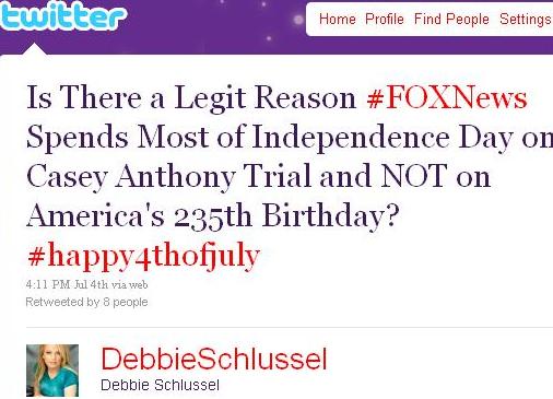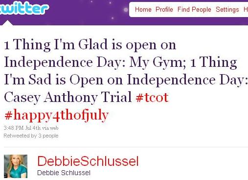As you’ll note, I’ve never before written about the Casey Anthony trial on this site. The national fascination with it sickens me. A trashy, slutty mother murdering her kid isn’t a new or remarkable thing. It’s happened before. It’ll happen again. The only thing remarkable here is the moronic jury that acquitted this uber-skank of murder. To me, it was sickening that, yesterday, instead of celebrating our nation’s 235th birthday, this jury of anti-Einsteins chose to keep hearing the case. That told me enough about which way they were headed. This was a jury not concerned with morals, with decorum, with rules. They were only concerned with themselves and wanting to get finished with the case. Hey, just like Casey Anthony. That’s what liberals–and morons–do. Here were my tweets from Twitter (follow me on Twitter), yesterday on the matter. The second one was a “Top Tweet” on Twitter.
