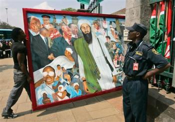 **** UPDATE: Here is a pic of the mural that bombing victims and their relatives put up, yesterday, to mark the embassy bombing in Kenya. I have mixed feelings about it. On the one hand, Bin Laden is in the middle of all these pics of injured humans, and that’s good since he caused death and destruction. But, on the other hand, he’s a star in it, as if honored. I also wish they had the guts to put an Islamic crescent in there, which, frankly, should be more prominent than Bin Laden. He’s the man, but not the ideology, behind the attacks. That ideology will long survive him and lead to more bombings.