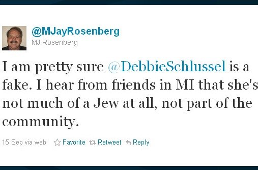 Nazi George Soros’ multi-million dollar far-left Media Matters for America organization says that I’m not a real Jew–that I’m a fake–because I’m not involved in far left-wing Jewish organizations in Michigan (the ones that butt-lick HAMAS and Hezbollah Muslims and support their unlimited immigration; the ones who won’t condemn Palestinian terrorism against Israel). Yes, according to Media Matters’ M. J. Rosenberg, formerly of AIPAC and far-left pan-Muslim U.S. Senator Carl Levin’s staff, I’m a fake Jew. Now that he’s recovered from AIPAC, Rosenberg is–in addition to his high-paid job at Media Matters–a contributor to Al-Jazeera. I love how Al-Jazeera’s Dhimmi Jew is the self-appointed new chief rabbi of the world and arbiter of who is a Jew. Check out this tweet that Rosenberg recently sent out on Twitter, below.