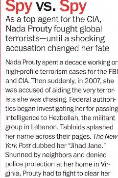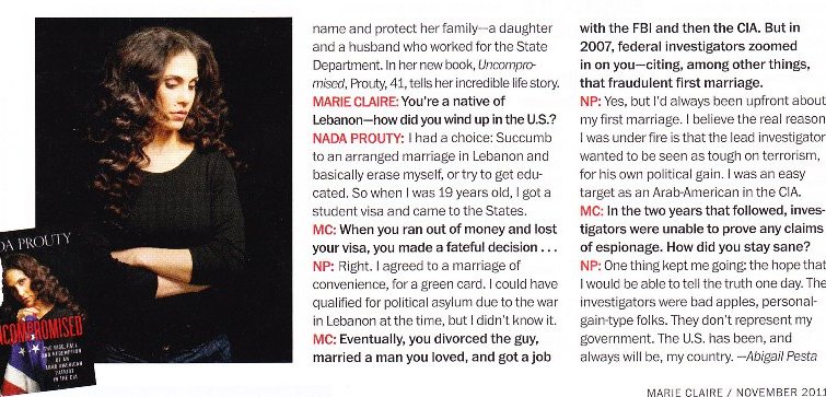 Tags: 60 Minutes, Arab, Arab American, book, brother-in-law, CIA, FBI, FBI HQ, Grenada, Hearst, Hezbollah, Hezbollah spy, Immigration Fraud, Israel Lebanese, La Shish, Lebanese, Marie Claire, Marie Claire Magazine, marriage, marriage fraud, morons with vaginas, Nada Nadim Al-Aouar DeLaDurantaye Valley Prouty, Nada Nadim Prouty, Nada Prouty, naturalization fraud, Sixty Minutes, spy, Uncompromised, Uncompromised: The Rise Fall And Redemption of an Arab American Patriot and CIA Agent, women's magazines