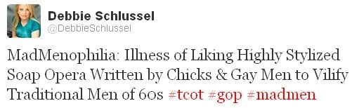 On Twitter (follow me on Twitter), I recently created a new word: MadMenophila. It’s definition: the illness of liking a highly stylized soap opera written by chicks and gay men to vilify traditional men of the early ’60s.