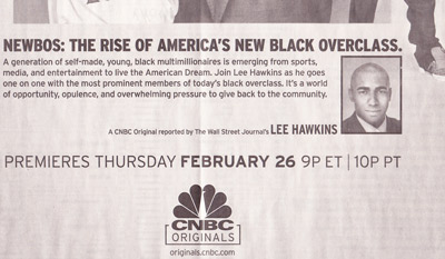 CNBC is heavily advertising a Thursday Night special, called, “NEWBOs: The Rise of America’s New Black Overclass.” The ads, featuring pictures of rappers Sean “Diddy” Combs, ‘Lil Wayne, and Wyclef Jean, LeBron James, and assorted other pro athletes, tout these men as “THE NEW AMERICAN DREAM.”