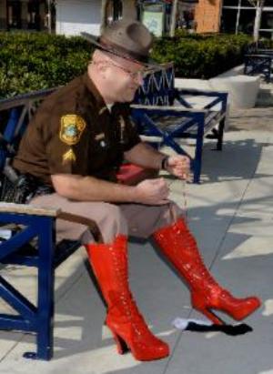 There’s a picture of a burly sheriff in a smokey-the-bear hat, lacing up knee-high, high heel boots. If he had to actually chase a criminal, I would LITERALLY fall on the ground laughing at him.